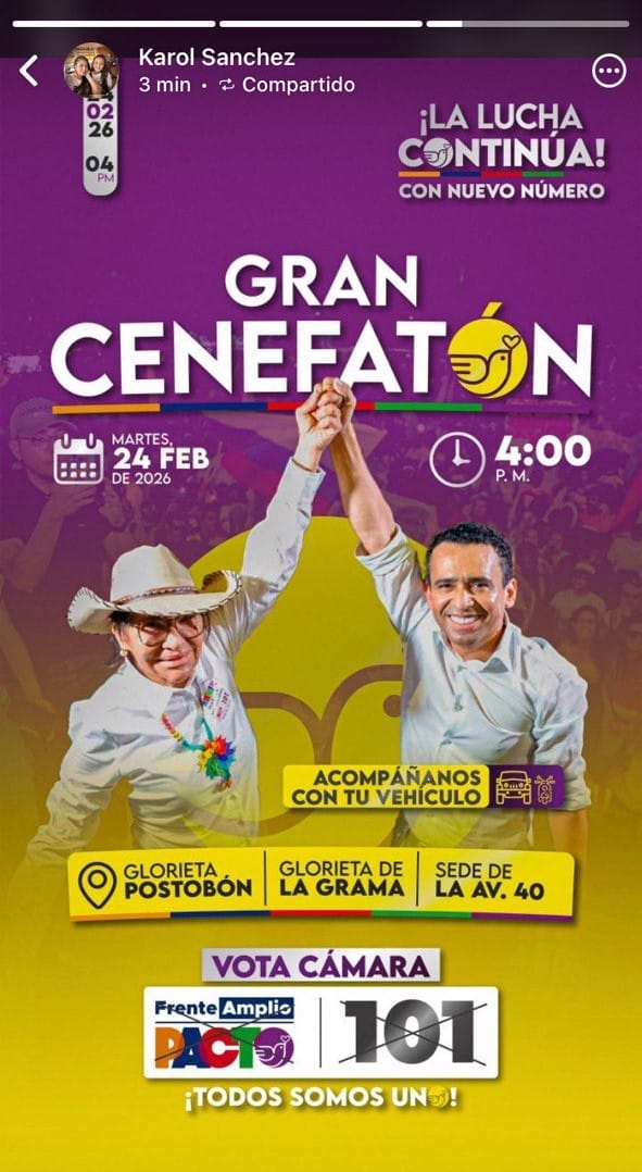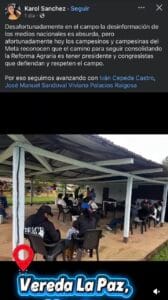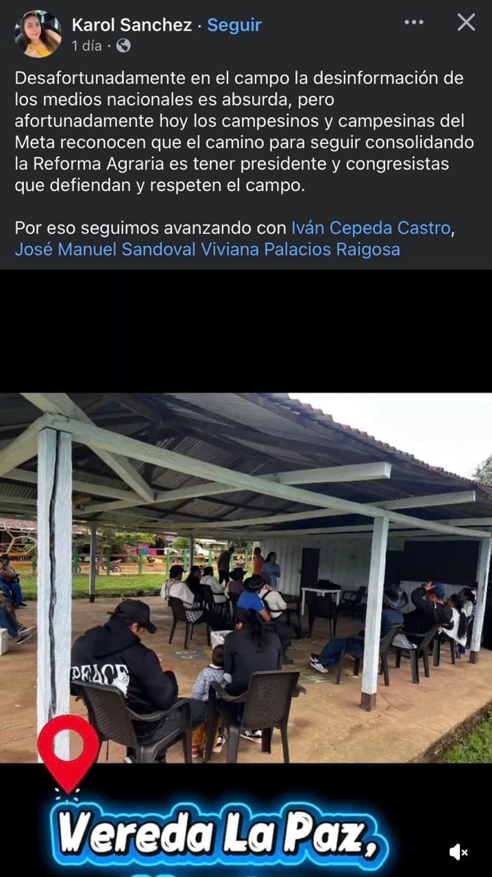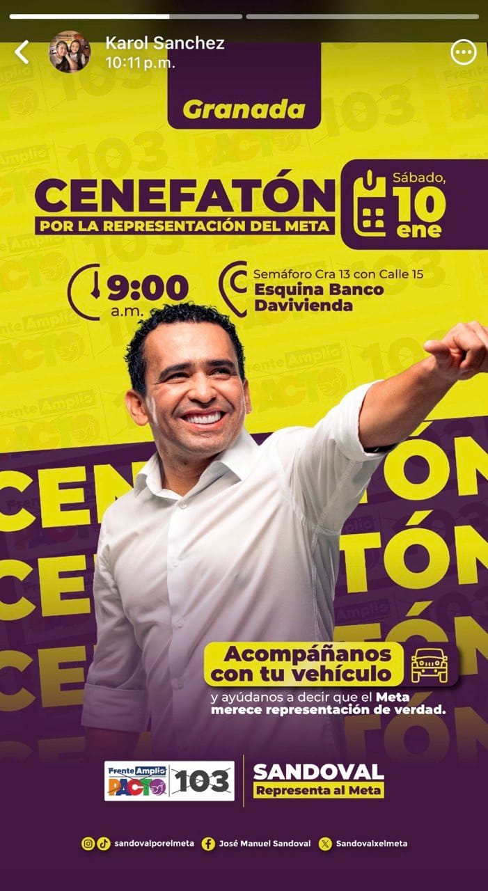 La evidencia más gráfica de esa integración apareció en las propias redes sociales de Viviana Palacios. El 3 de febrero de 2026, antes de que el CNE sacara a Sandoval de la contienda, Palacios publicó una historia en Instagram con un video de una de sus reuniones de campaña. En las imágenes, varios asistentes portaban propaganda impresa de José Manuel Sandoval. Dos candidaturas distintas, una para la curul de paz y otra para la cámara ordinaria, compartiendo el mismo evento y material de campaña.