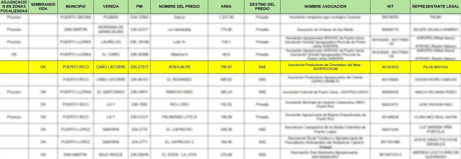 El caso más documentado es el de Pilar Mayusa Castro, quien para el 24 de julio de 2024 fungía como representante legal de la Asociación de Productores de Chontaduro del Meta —Asoprochom—, fecha en que la ANT entregó provisionalmente a esa organización el predio Atahualpa, ubicado en Puerto Rico, Meta, con 799,8 hectáreas y un valor aportado por la entidad de 700 millones de pesos. Ese proceso fue acompañado por Karol Lucero Sánchez Moyano, contratista de la ANT, quien según su propio informe de actividades del 11 de abril de 2025 realizó «acompañamiento a dos organizaciones campesinas a solicitud de sus representantes legales que fueron beneficiarias de procesos de adjudicación de tierras». Los documentos de la entidad y un registro de una reunión virtual entre Sánchez y Mayusa confirman ese vínculo institucional. Hoy, tanto Karol Sánchez como Pilar Mayusa hacen campaña activa por Viviana Palacios.